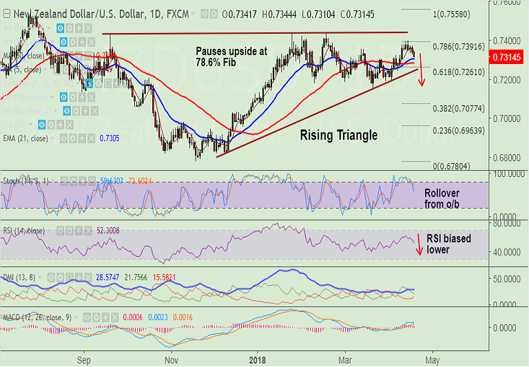 - The major is on track to test 0.73 levels, intraday bias is bearish. Technical indicators are turning bearish.