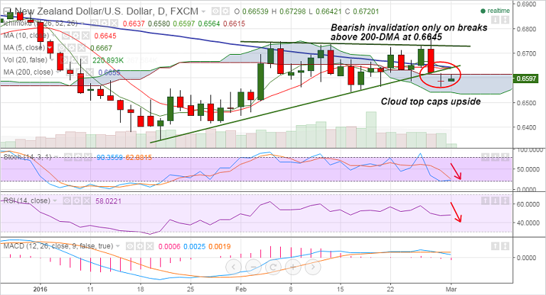- Immediate resistance on the upside is seen at 0.6615 (Cloud top), and then at 0.6637 (5-DMA). Bearish invalidation only on breaks above 200-DMA at 0.6645.