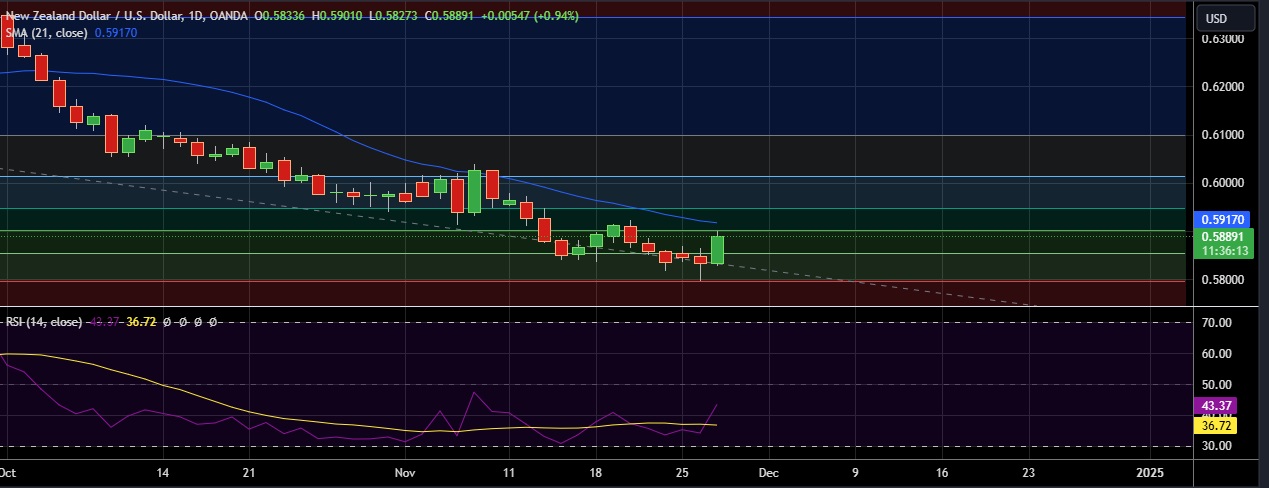 • At (GMT 10:23) Kiwi dollar was trading up at 0.97% at $0.5890 against the U.S. dollar.