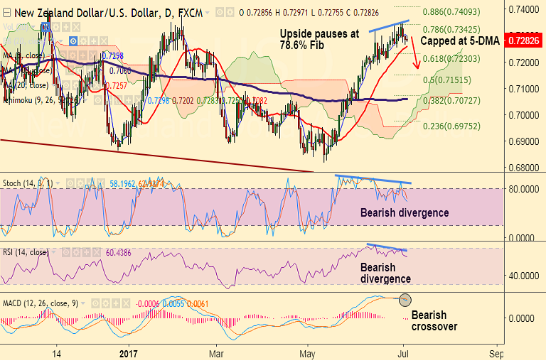 - Upside in the pair capped at 5-DMA at 0.7299, Doji formation seen on daily candle.