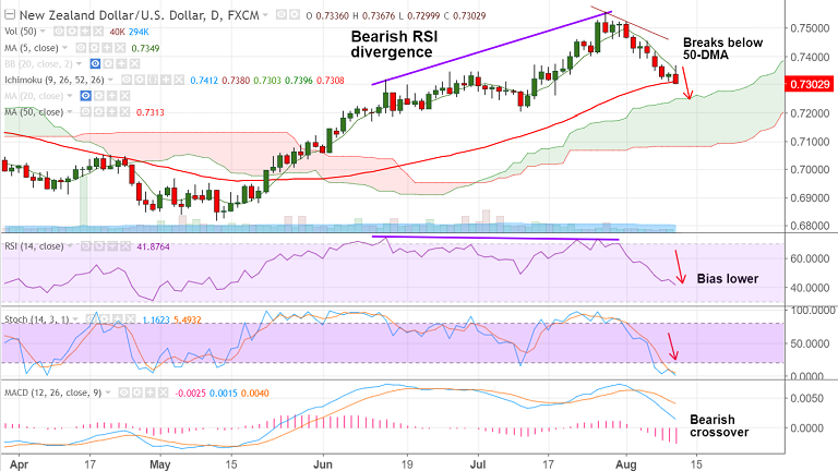 - NZD/USD has breached 50-DMA support at 0.7313 after recovery in the pair was rejected at highs.