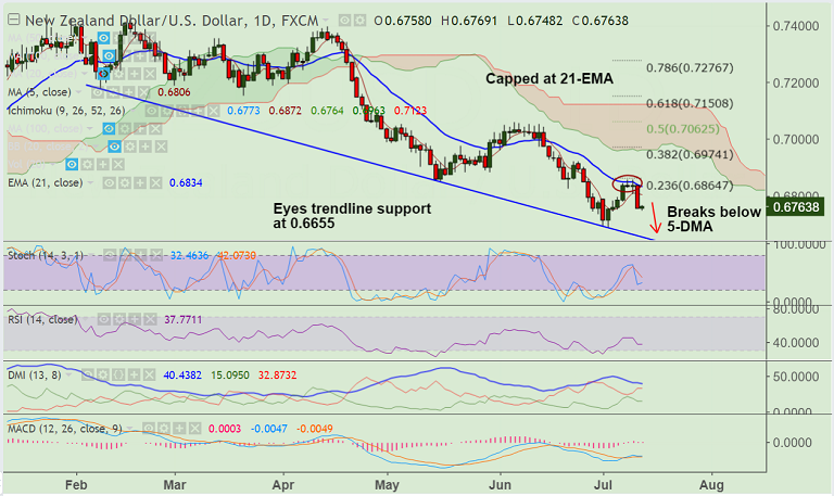 - Scope for test of major trendline support at 0.6655. Further upside only on break above 21-EMA.