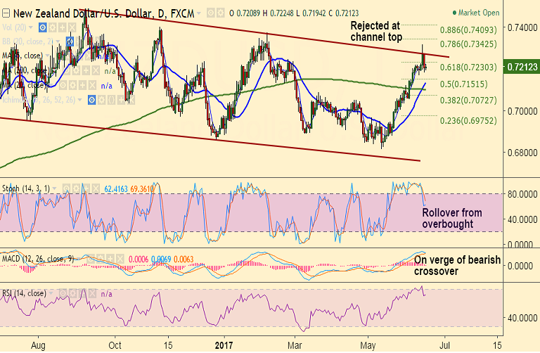- NZD/USD was rejected at channel top at 0.7275, hovers around 5-DMA at 0.7223.