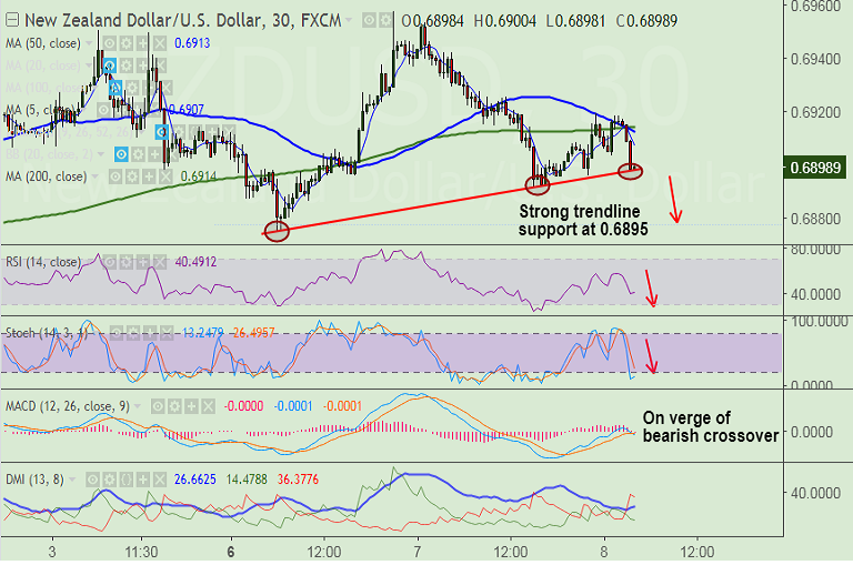 - The pair has slipped below 5-DMA and now finds strong support at 0.6895 (trendline). Break below will see further weakness.