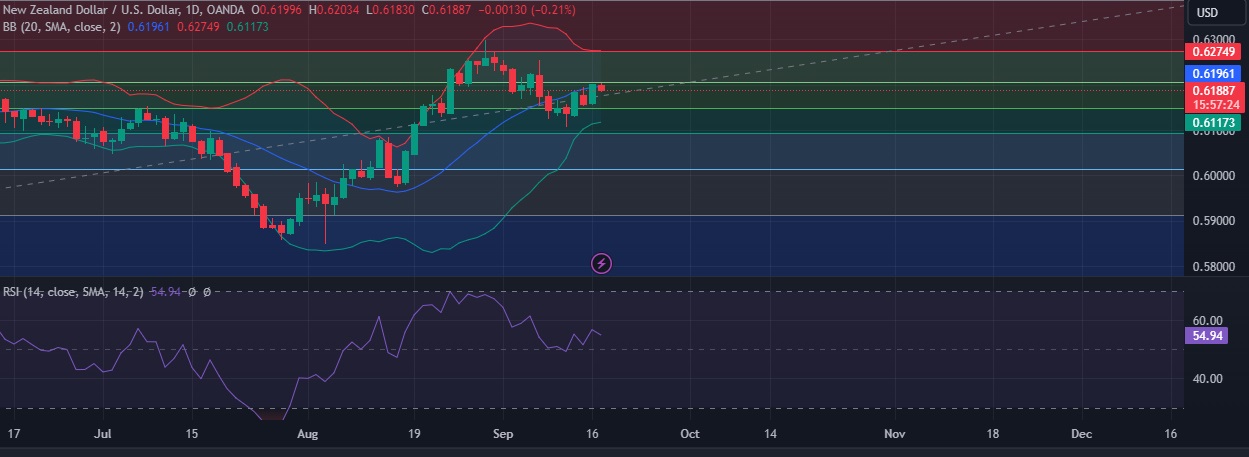 •Support is seen at 0.6149 (50%fib) and break below could take the pair towards 0.6133(Lower BB).