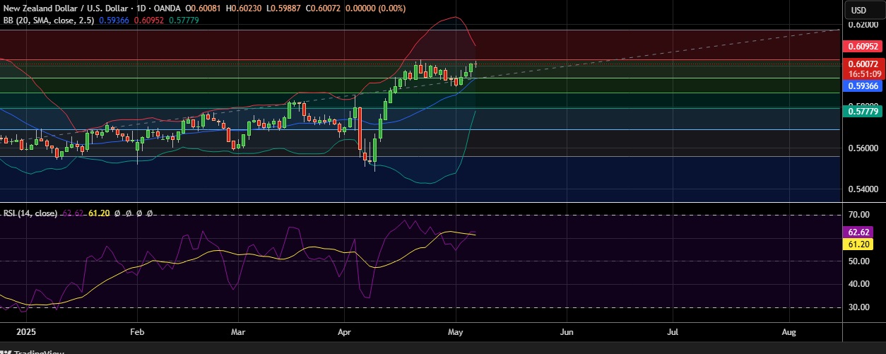 • Immediate resistance is located at 0.6029(23.6%fib), any close above will push the pair towards 0.6091 (Higher BB).