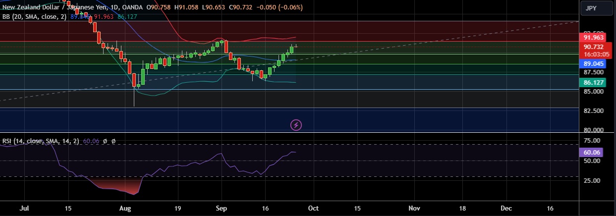 • Immediate resistance is located at 91.46(23.6%fib), any close above will push the pair towards 91.96 (Higher BB).