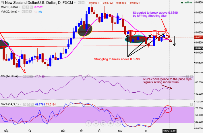 The pair has currently making all efforts to break support at 0.6556 today after failing to hold the resistance at 0.6590 by forming shooting star pattern candle yesterday.