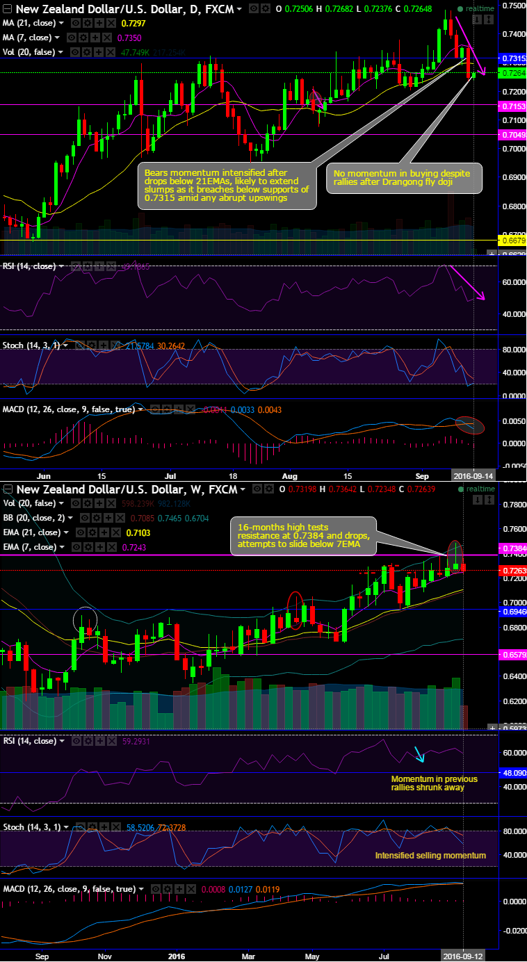 NZDUSD has formed shooting star candlestick pattern at peaks of 16-months highs which is bearish in nature (at 0.7318 levels, see weekly chart).