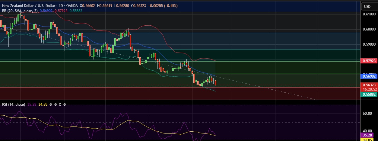 • Support is seen at 0.5615 (23.6%fib) and break below could take the pair towards 0.5591 (Lower BB).