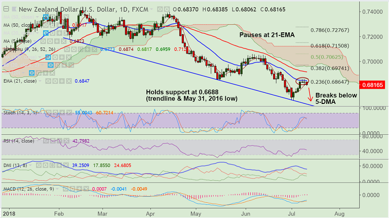 - NZD/USD breaks below 5-DMA support at 0.6822, trades 0.35% lower on the day.