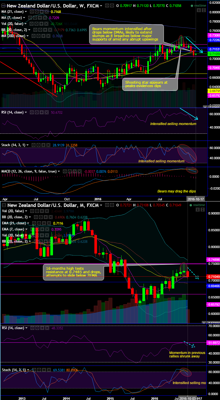 Ever since the pair has rejected 16-months highs at 0.7485 and kept tumbling, attempts to slide below 7EMA (see monthly charts), Kiwi dollar seemed like exhausted at this juncture from the last couple of weeks but for now “Shooting Star” pattern occurred to signify weakness.
