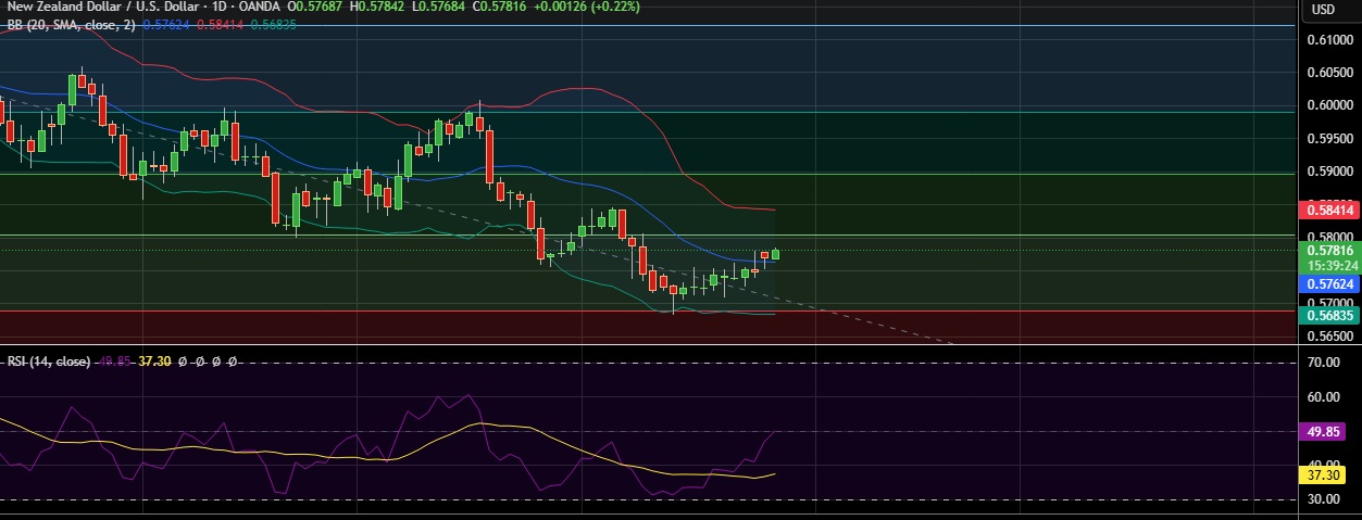 • Immediate resistance is located at 0.5805(38.2%fib), any close above will push the pair towards 0.5843(Higher BB).