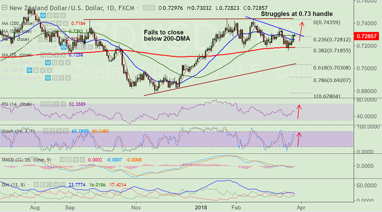 - NZD/USD struggles to extend gains above 0.73 handle, breakout to see further upside.