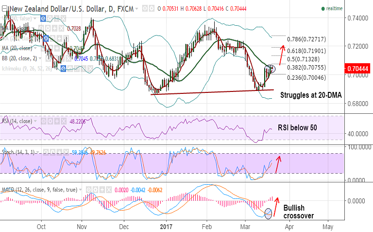Support levels - 0.7028 (5-DMA), 0.6975 (Mar 17 low), 0.6916 (50% Fib of 0.6347 to 0.7485 rally).