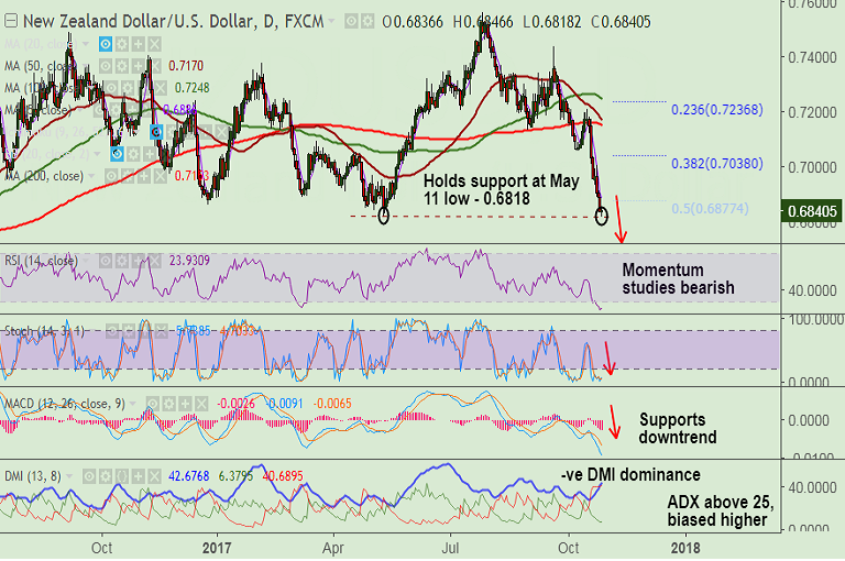 - The pair has held minor support at 0.6817 (May 11 lows), break below will see further downside.