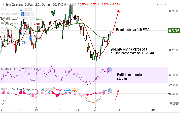 - NZD/USD breaks above 110-EMA on hourly charts, after taking 50-DMA support on Monday's trade.