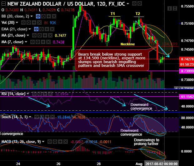 For now, any failure swings below 0.7439 levels (7SMA), more slumps are expected upon bearish SMA crossover and clear downward convergence on leading oscillators (on 2H charts).