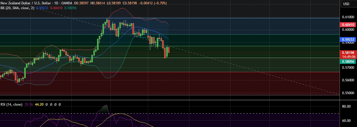 •Support is seen at 0.5809(Lower BB) and break below could take the pair towards 0.5778(38.2%fib).