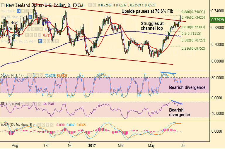 - NZD/USD eases from 4-month highs at 0.7343, has slipped below 0.73 handle and is currently trading at 0.7291.