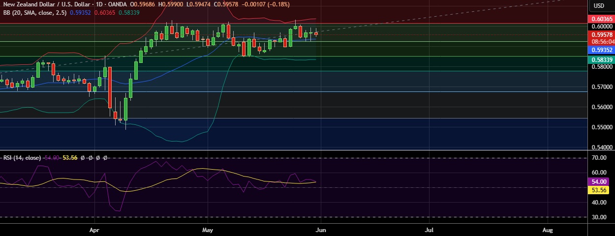 • Immediate resistance is located at 0.6017(23.6%fib), any close above will push the pair towards 0.6036(Higher BB).