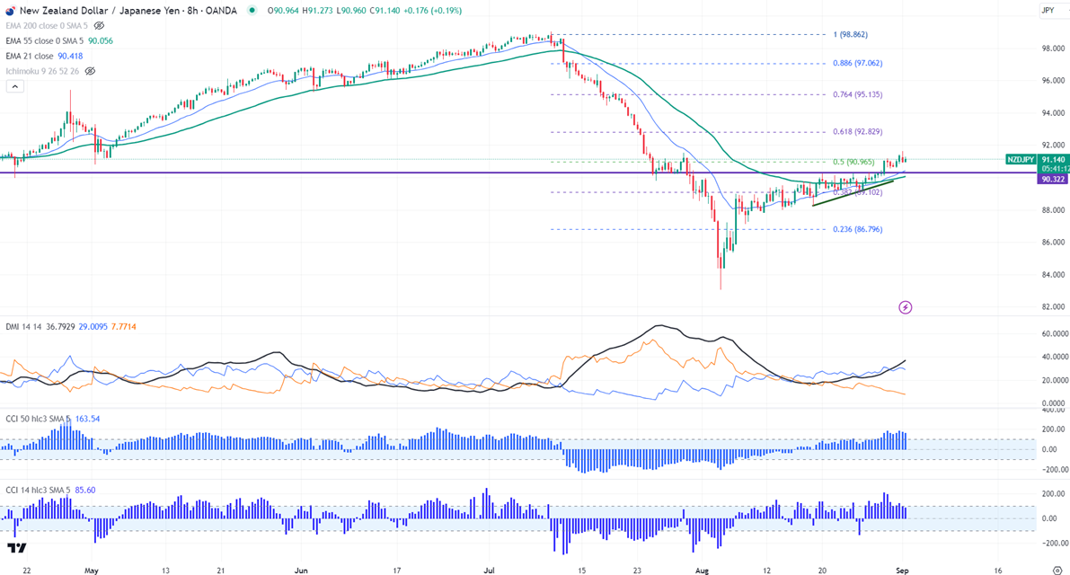 NZDJPY was among the best performers this week and closed near the weekly high. It hit a high of 91.42 and is currently trading around 91.36.