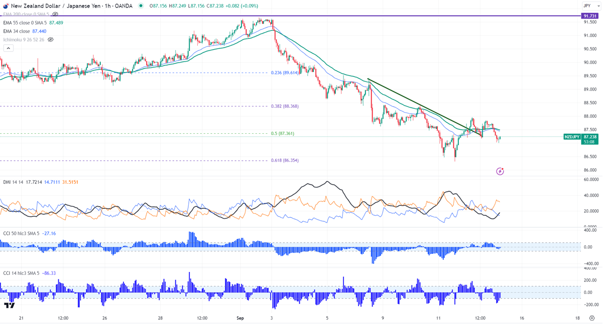The pair trades below 34- and 55 EMA in the 1-hour chart.