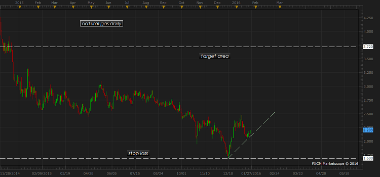 Buy natural gas @ current price $2.2/mmbtu and at dips with target around $3.72/mmbtu and stop loss at 1.68/pound.