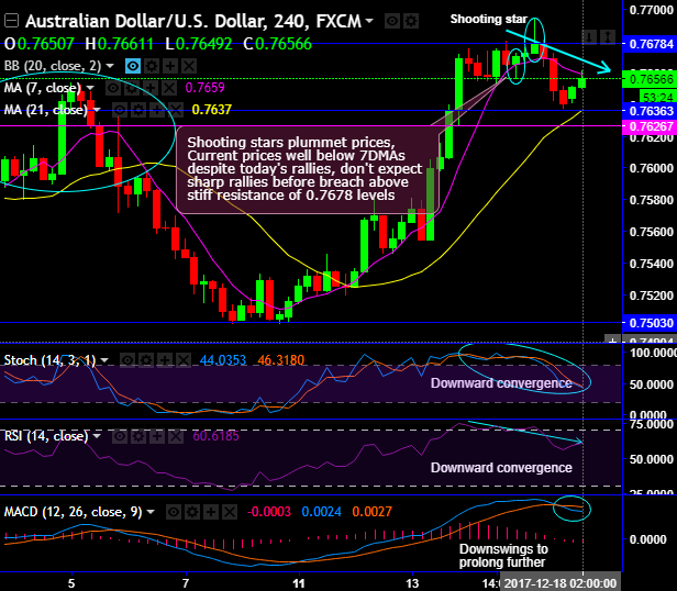 Shooting stars have occurred at 0.7828 and 0.7678 levels on monthly and daily plotting respectively. Hanging man on 0.7670 levels on the daily chart. Consequently, the prices have begun plummeting.