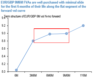 6M in 9M EURGBP forward volatility (9M6M FVAs) fits the bill, since it provides a 6-month runway of little/no static slide along a flat long-end vol curve (refer above chart), is marginally (0.5 vol) cheap on an RV basis versus equivalent GBPUSD structures, and has the additional kicker of participating in any Euro-related volatility brought about by either a more aggressive than expected ECB taper or resurgence of Italian election risk premium.