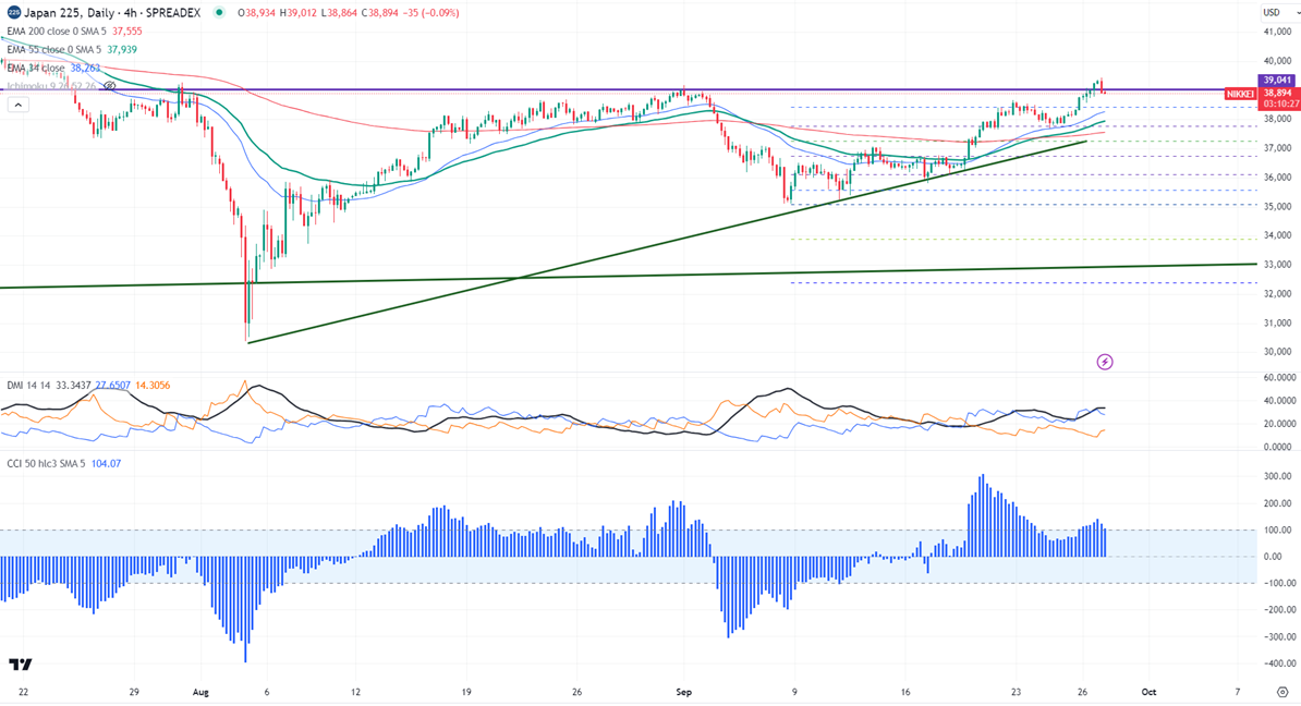 Nikkei gained sharply and surpassed the 39275 high made after BOJ hiked rates by 25 bpbs. It hit a high of 38826 at the time of writing and is currently trading around 38776.