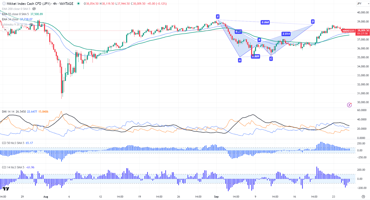 Nikkei pared some of its gains due to profit booking. It hits a low of 37660 yesterday and is currently trading around 38009.