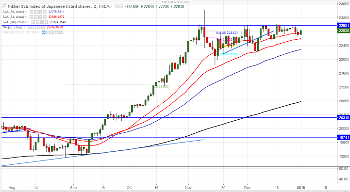 - Nikkei has shown a minor jump after a consolidation due to holidays. The index jumped slightly 0.55% on account of slightly weak yen.Nikkei was consolidating in narrow range between 23022 and 22048 for the past ten trading session.The index jumped almost 4800 points from the 2017 low of 18653 made on Jan 2017. It is currently trading around 22830.