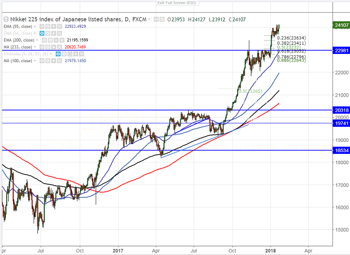 - Nikkei has shown a minor recovery after hitting low of 23552 on Jan 10th 2018. The major reason for recovery was due to slight weakness in yen and strong global markets. US Dow, S&P 500 and NASDAQ finish records as government shutdown ends. It is currently trading around 24102 0.64% higher.