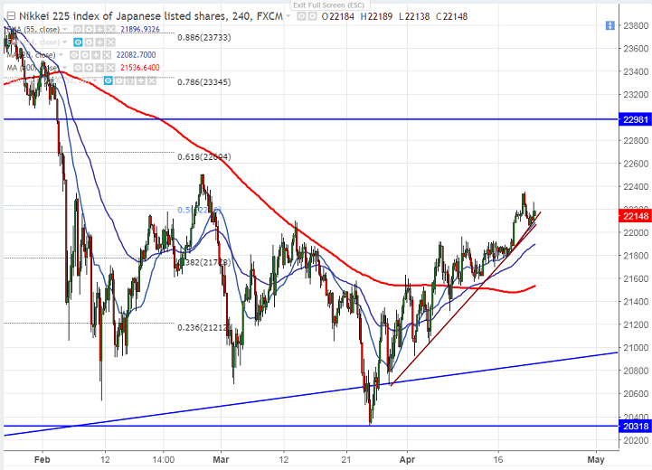 - Nikkei has shown a profit booking from one month high on account of minor weakness in US market. The index rose more than 2.5% this week on account of weak yen. US markets Dow jones and S&P500 has closed marginally weaker. US futures continuing its range bound trade and is trading with Dow jones at 24664 (0%) and S&P500 2695 (0.089 higher).It is currently trading around 22178 0.19% higher.