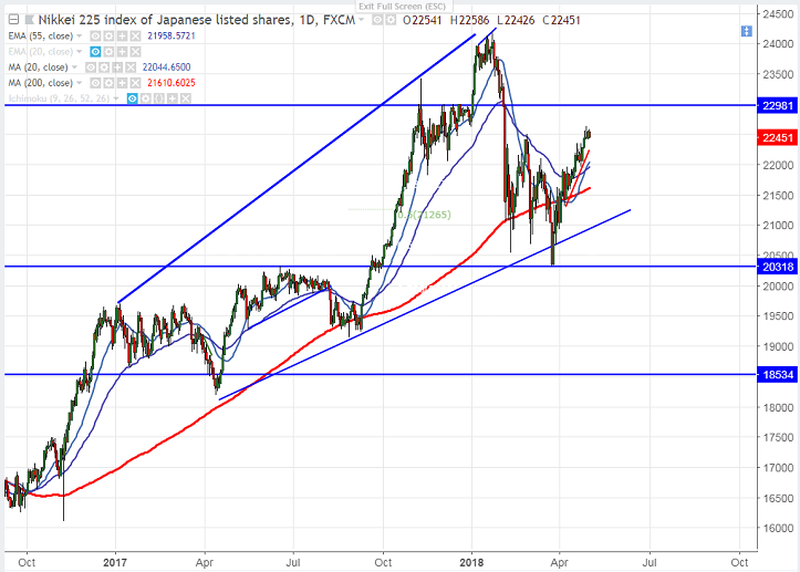 - Nikkei is consolidating in narrow range after hitting high of 22636 on account of holiday in Japan. US markets pared early losses and gained almost 1.29% from the low and closed at Dow jones 24099 (0.27% lower) and S&P500 2654 (0.25% higher). US futures is trading slightly positive with Dow jones at 24200 (0.17% higher) and S&P500 2649 (0.18% lower).It is currently trading around 22516 0.37% higher.