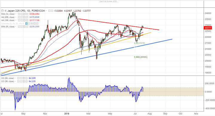 - Asian markets are trading slightly positive with Nikkei trading flat. US equities was trading higher yesterday followed by better than expected banking earnings. US markets has closed positively for fifth straight session. US market has closed marginal higher with Dow Jones at 25199 (0.32% higher) and S&P500 2815 (0.22% higher). Chinese market is trading slightly lower after more than 2% recovery.It is currently trading around 2771 (0.53% lower). USD/JPY which is the main indicator of geo political tension is trading higher which is also supporting Nikkei. US futures is trading higher with Dow Jones at 25177 (0.01% higher) and S&P500 2811 (0.03% higher). Nikkei is currently trading around 22809 0.33% lower.