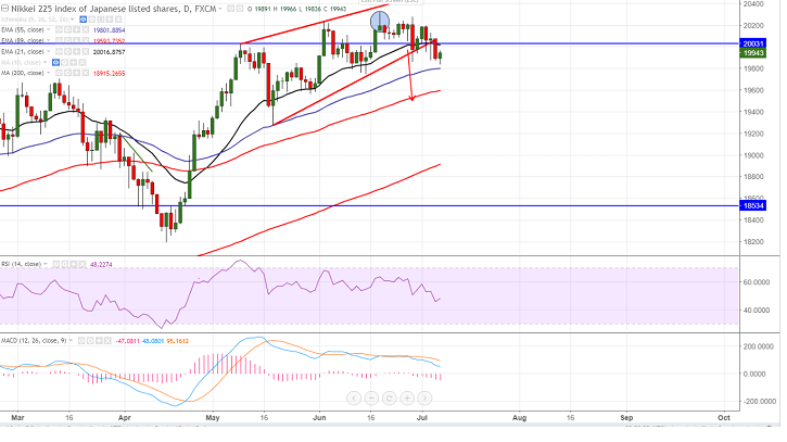 - The near term resistance of Nikkei is around 20400 (trend line joining 20019 and 20230) and break above will take the index to 20477 (161.8% retracement of 20019 and 19277) /20530 (161.8% retracement of 20220 and 19744)/20649 (161.8% retracement of 19698 and 18193).