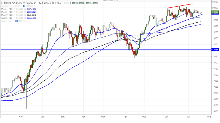 - Nikkei is consolidating in arrow range between 20319 and 19836 for the past one month. The index has formed a temporary top around 20319 and any further bullish continuation only above that level. It is currently trading around 20080 0.27% higher.