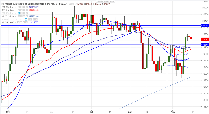 - Nikkei has shown a minor decline after hitting hits 1- month high at 19902 on account of North Korea tensions. The index jumped almost 650 points from the low and it is trading around 19822 0.18% lower.