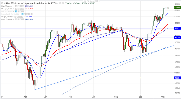 - Nikkei has shown a minor dip from the high of 20755 on weaker than expected US jobs data. US economy has lost 33000 jobs previous month compared to forecast of 90k due to hurricane Harvey and Irma.Nikkei has formed a temporary bottom around 20200 and is currently trading around 20690 0.15% higher.