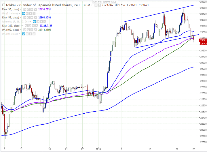 - Nikkei has shown a minor decline of almost 500 points after hitting high of 24122. The major reason for slight decline was due to huge sell off in USD/JPY pair. US S&P 500 has shown a minor sell-off from the all-time high of 2852. It is currently trading around 23656 0.40% lower.