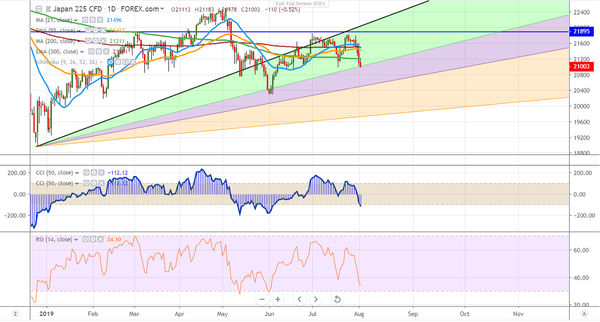 Nikkei has lost more than 500 points after Donald Trump said that the US will impose a 10% tariff on the remaining $300 billion. US markets have closed more than 1% lower with Dow Jones 26583 (1.05%) and S&P500 2953 (0.90%). The Japanese index hits a low of 21013 and is currently trading around 21068.