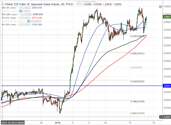 - Nikkei has shown a minor recovery after hitting low of 23647. The major reason for recovery was due to slight weakness in yen. US dow and S&P 500 shown a correction of 385 and 40 pionts from the life time high. It is currently trading around 23832 0.4% higher.