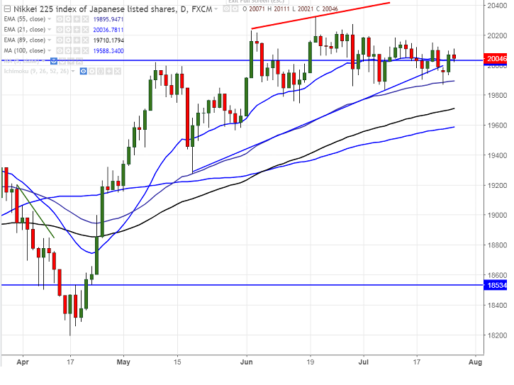 - The near term resistance of Nikkei is around 20400 (trend line joining 20230 and 20319) and break above will take the index to 20477 (161.8% retracement of 20019 and 19277) /20530 (161.8% retracement of 20220 and 19744)/20649 (161.8% retracement of 19698 and 18193).