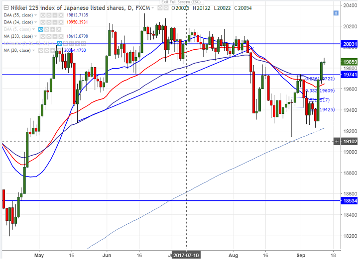 - Nikkei hits 1- month high at 19899 at the time of writing on account of declining yen and hurricanes hitting US ebbed. The index jumped almost 650 points from the low and it is trading around 19864 0.06% higher.