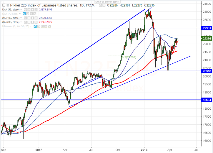 - Nikkei is continuing its third week of bullishness after hitting low of 20925. The index showing a good strength on account of yen weakness and slight easing of geopolitical tensions. The yen declined sharply against all majors especially against USD. US markets Dow jones and S&P500 has halted five day losing streak highest since Mar 2017 and shown a good recovery of more than 1% from low on account positive earnings from Boeing . US futures is trading flat with Dow jones at 24111 (0.03% lower) and S&P500 2630 (0.01% higher).It is currently trading around 22331 0.20% higher.