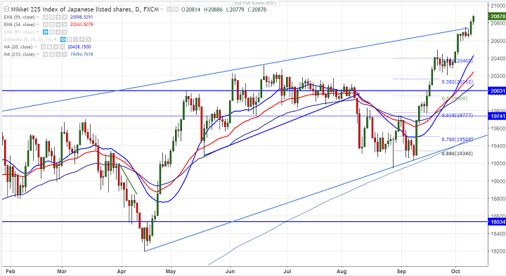 - Nikkei trading slightly higher and hits fresh 2- year high after breaking high of 20835. The index jumped till 20886 and prices are supported by weak yen and strong global indices. Nikkei has formed a temporary bottom around 20200 and is currently trading around 20883 0.33% higher.