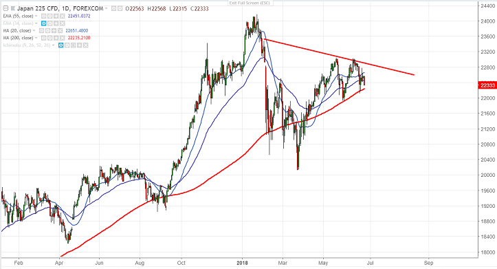 - Asian markets pared most of its gains from yesterday high as trade worries woes investor sentiment.US market has closed slightly positive with Dow Jones 24580 (0.19% higher) and S&P500 2754 (0.19% higher). Donald Trump has threatened to impose 20% tariff on Friday on all imports of EU assembled car. The fall in the Asian markets was triggered by a report from Wall street journal that Trump is planning to ban Chinese companies from investing in U.S technology.USDJPY which is the main indicator of geo political tension declined more than 150 pips yesterday and this shows that trade war between US and other economies has escalated.Nikkei has declined almost 200 points from yesterday’s high. US futures is trading marginally higher with Dow Jones at 24419 (0.61% lower) and S&P500 2740 (0.40% lower). Nikkei is currently trading around 22355 0.94% lower.