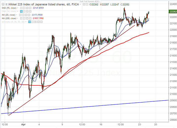 - Nikkei recovered more than 1% from yesterday low on account of weak yen. The yen declined sharply against all majors on easing geo political tensions. US markets Dow jones and S&P500 has closed flat around 0.01%. US futures also continuing its range bound trade and is trading with Dow jones at 24503 (0.2% higher) and S&P500 2672 (0.04% higher).It is currently trading around 22272 0.41% higher.